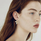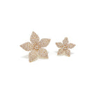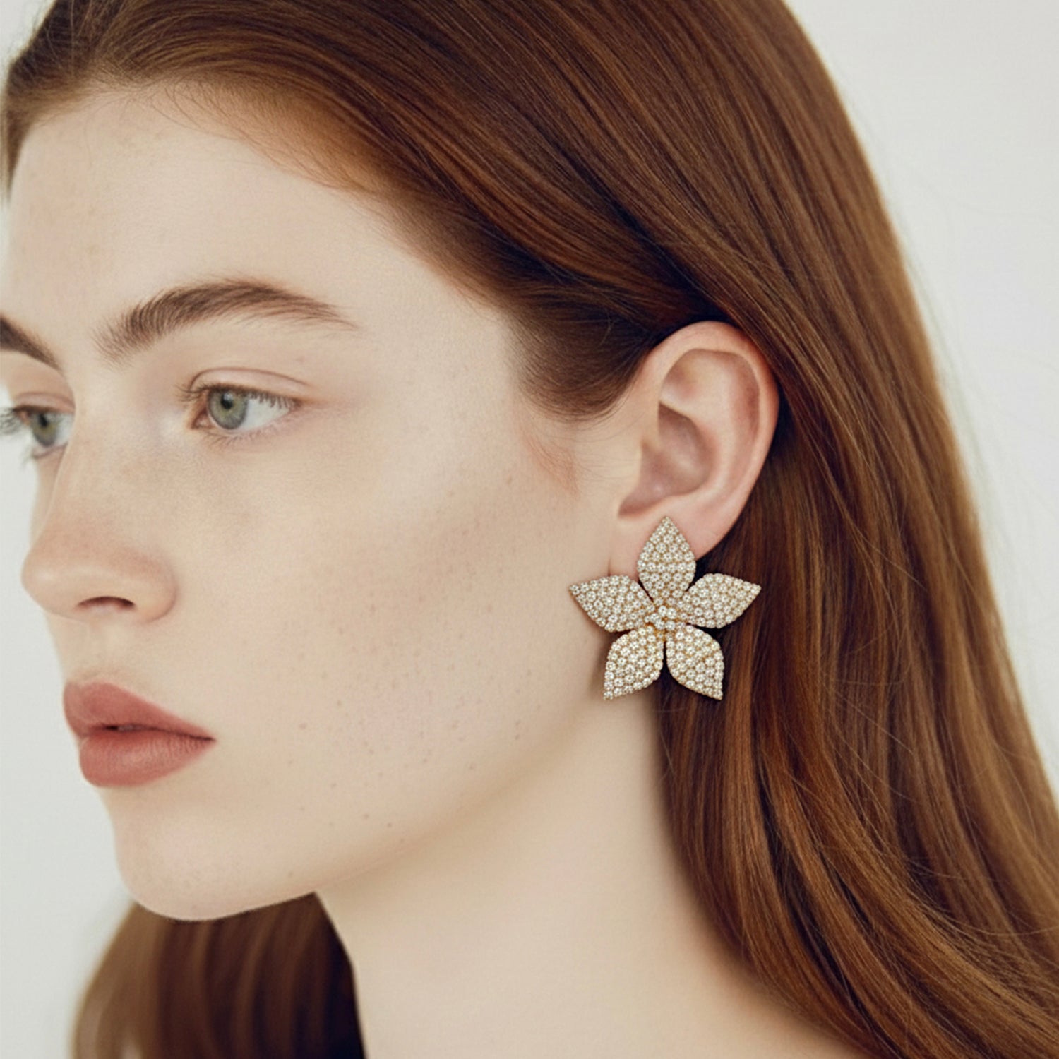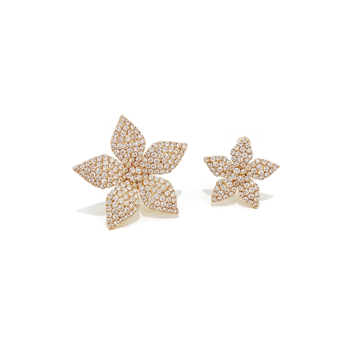 A modern expression of elegance, these asymmetrical floral earrings shimmer with hand-set crystals. Their sculptural design and radiant finish capture the essence of refined sophistication—perfect for evening wear or a statement touch of everyday luxury.