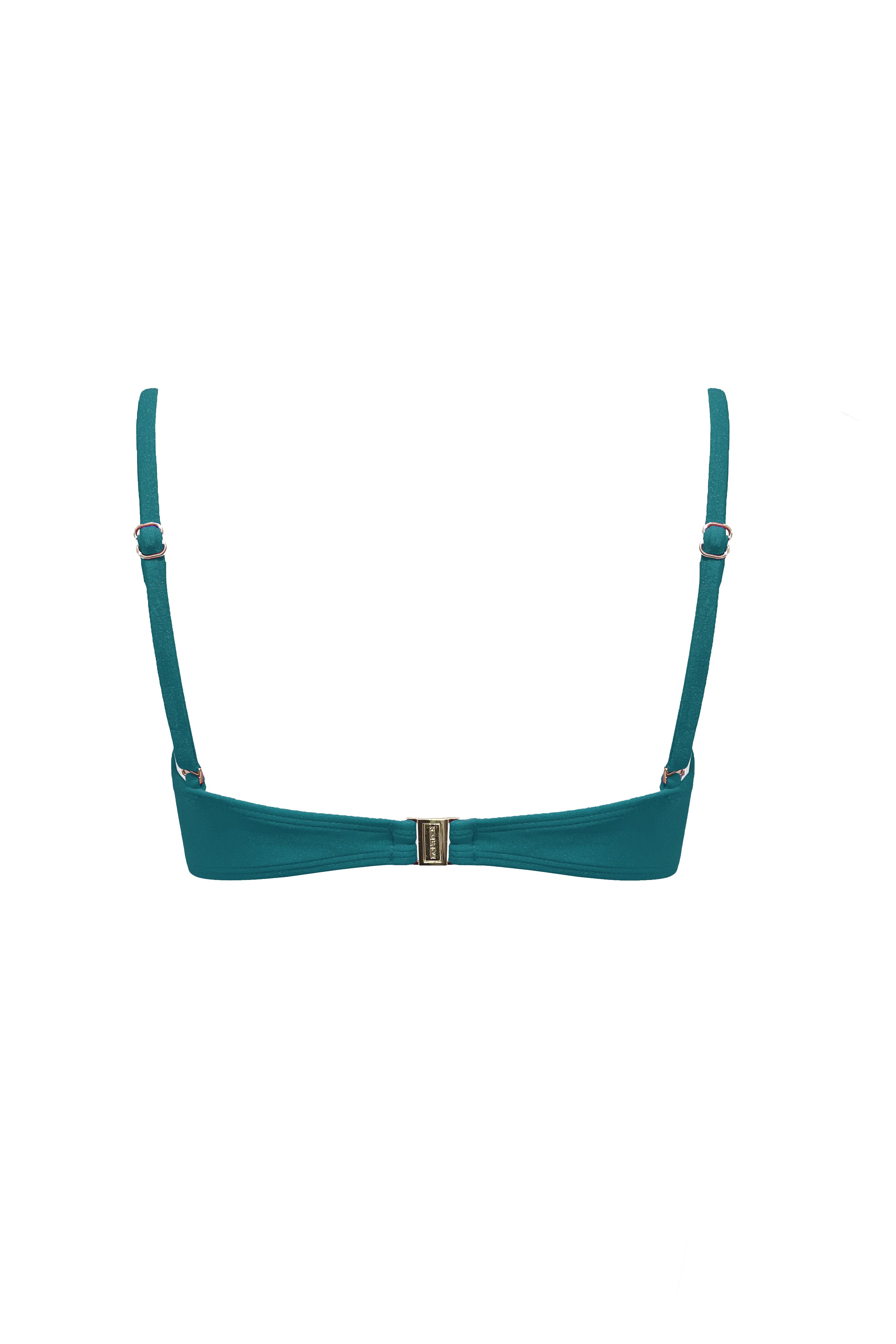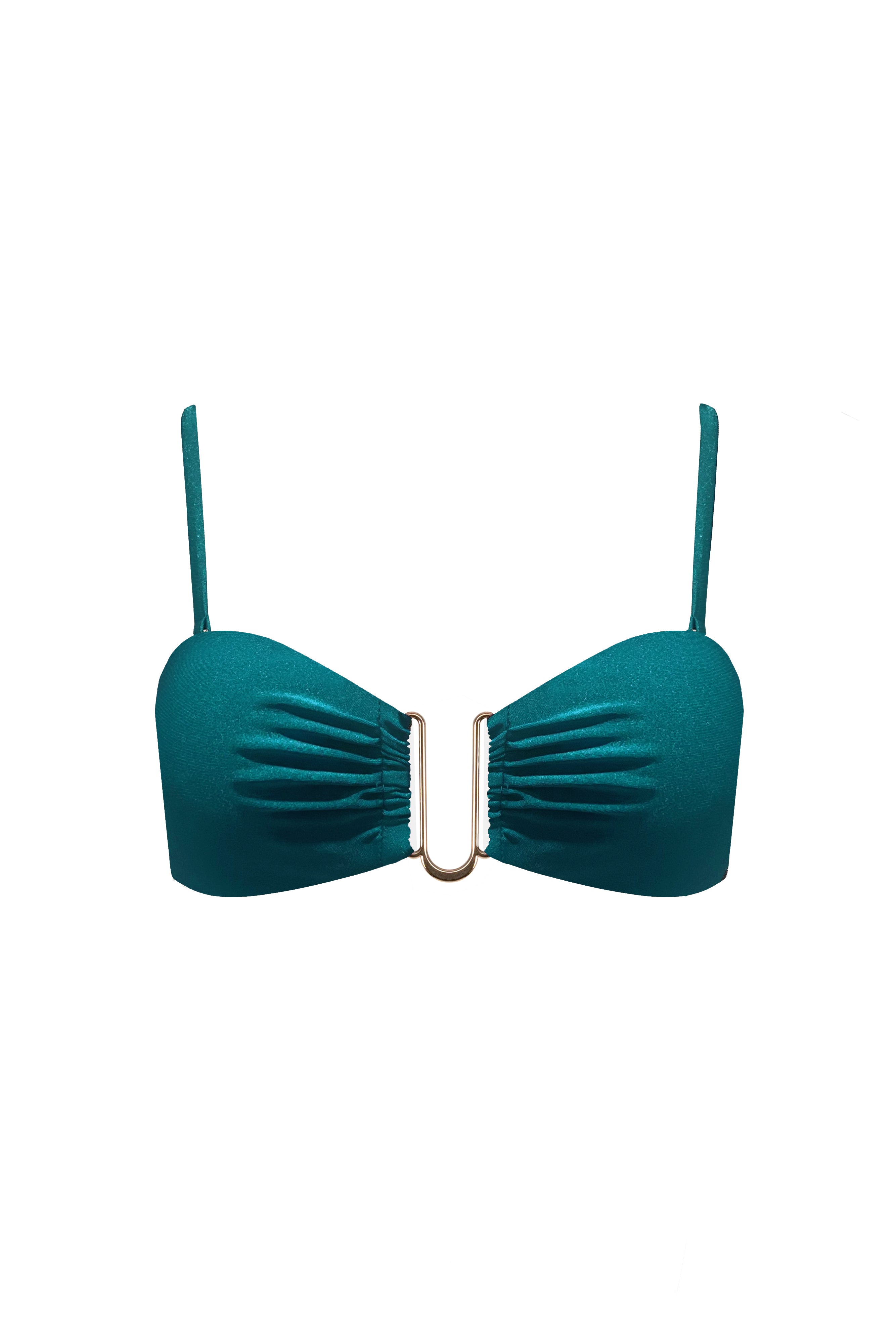 The Cindy Bikini Top features a structured, bandeau design that provides both support and style. The custom gold detail at the front and sweetheart neckline creates a feminine and flattering silhouette, making it a perfect choice for chic poolside or beachwear.